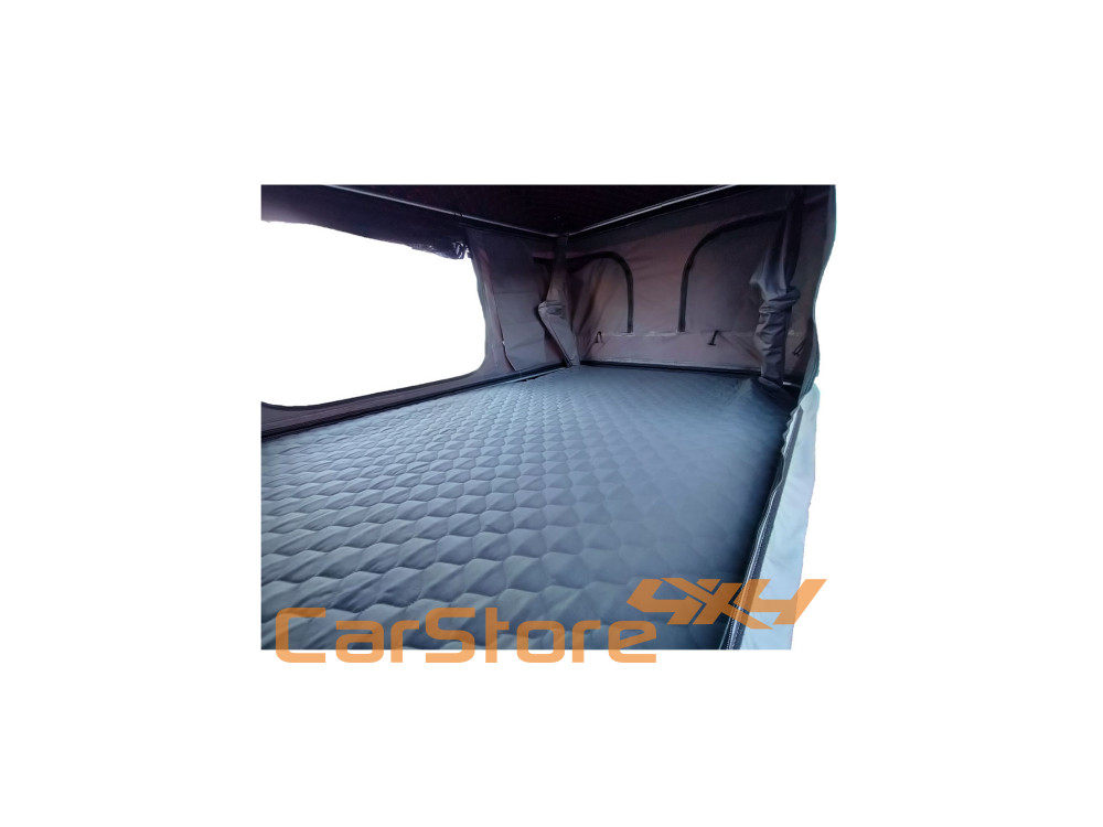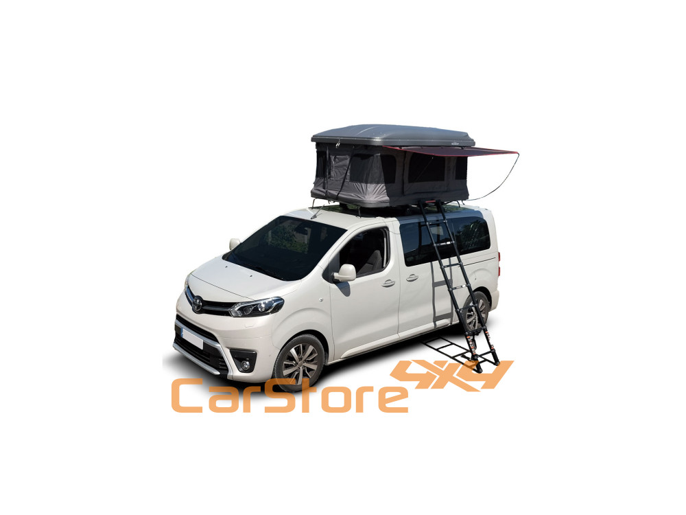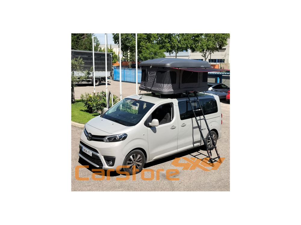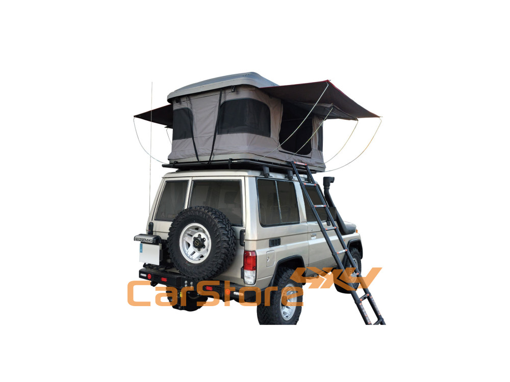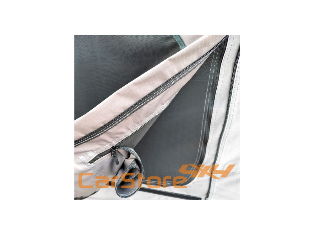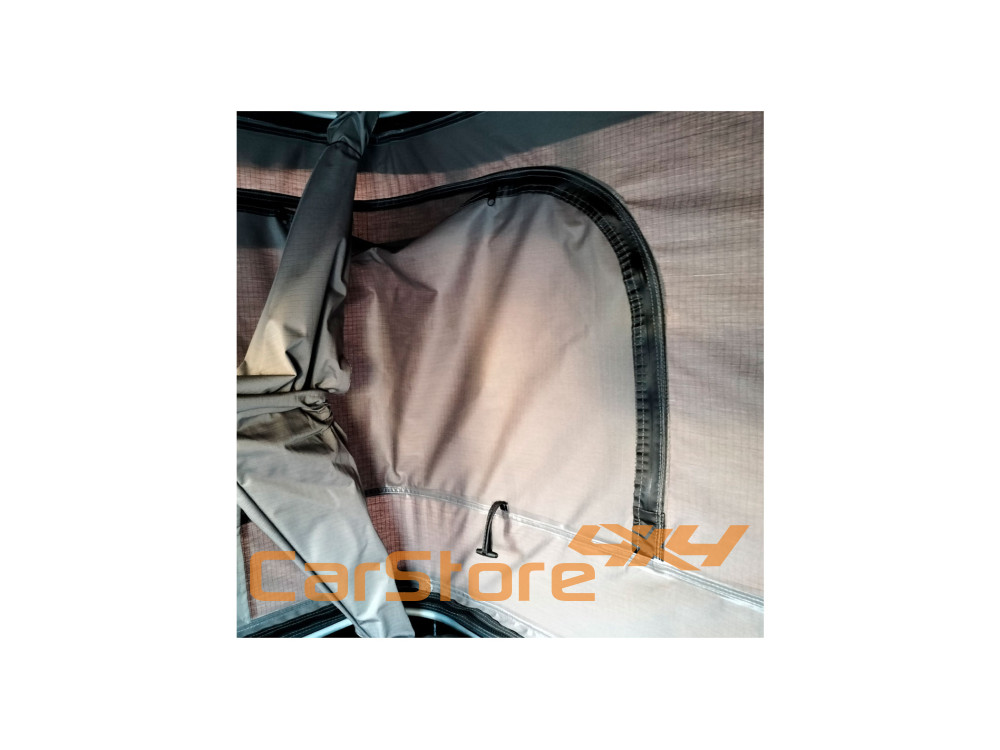 Esta barraca do telhado tem duas entradas laterais (ao pé das entradas existem suportes para fixação da escada de alumínio) e uma janela panorâmica com mosquiteiro em cada canto da tenda, fornecendo mais iluminação e facilitação da ventilação , além de desfrutar uma vista de quase 360o .