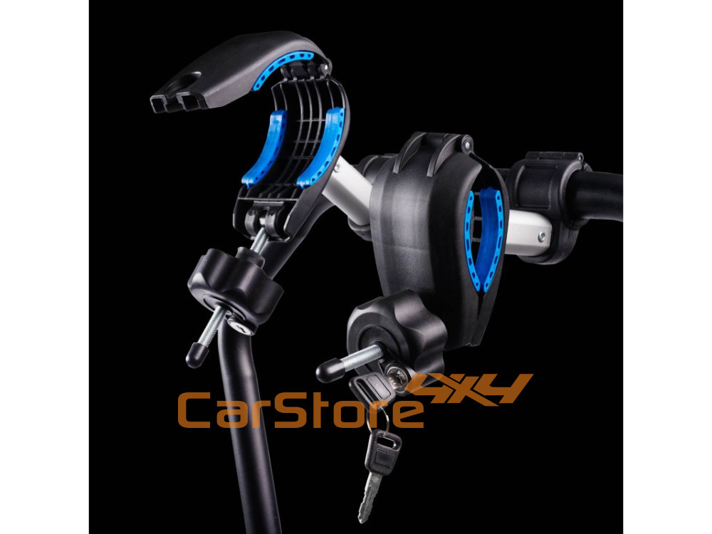 Braços móveis para a fixação das bicicletas revestidos a borracha para proteger o quadro.
